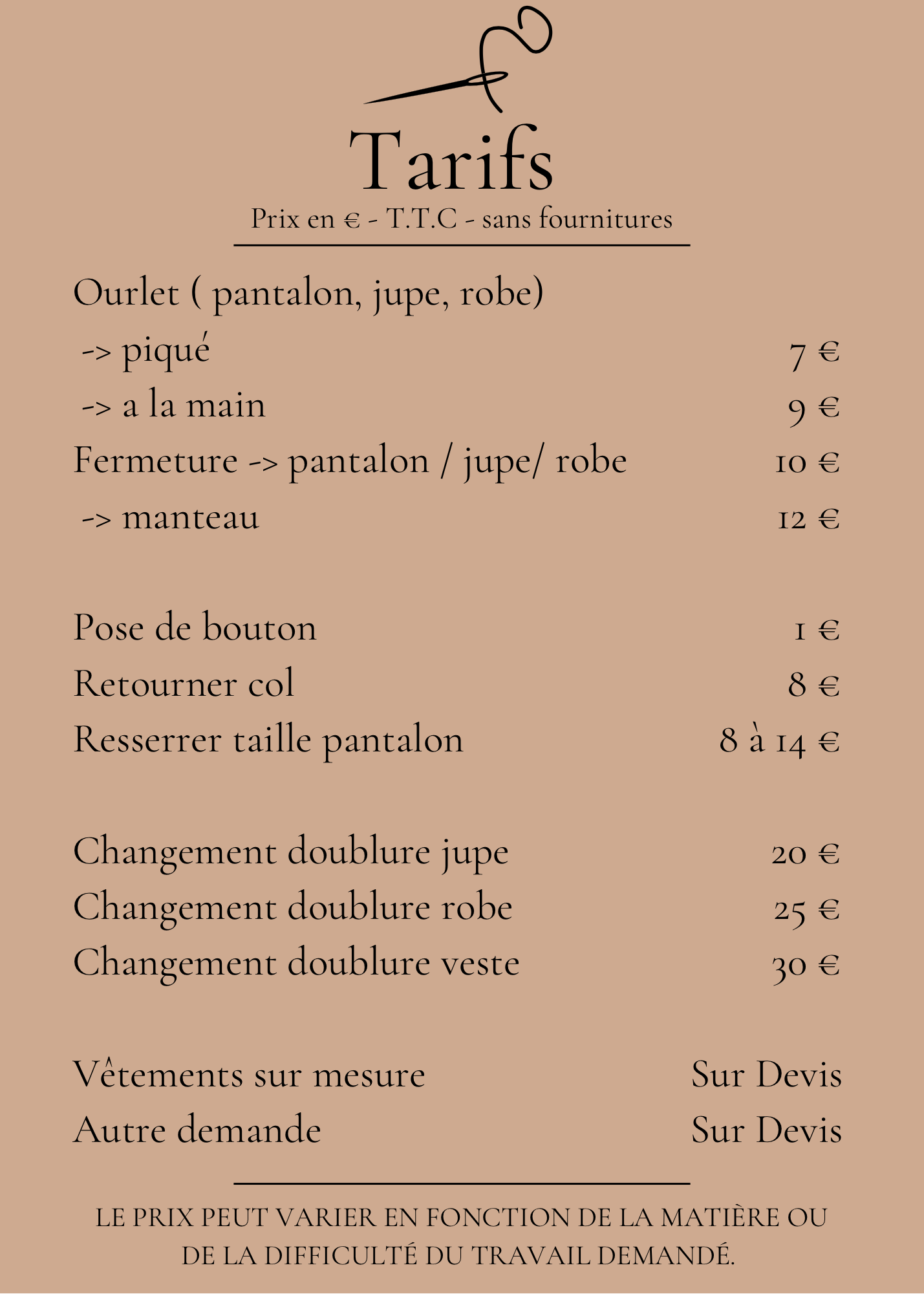 Vous trouverez ci-dessous la liste des prestations et des tarifs que je propose. Cette liste est non exhaustive, n'hésitez pas à me contacter pour toute autre demande !